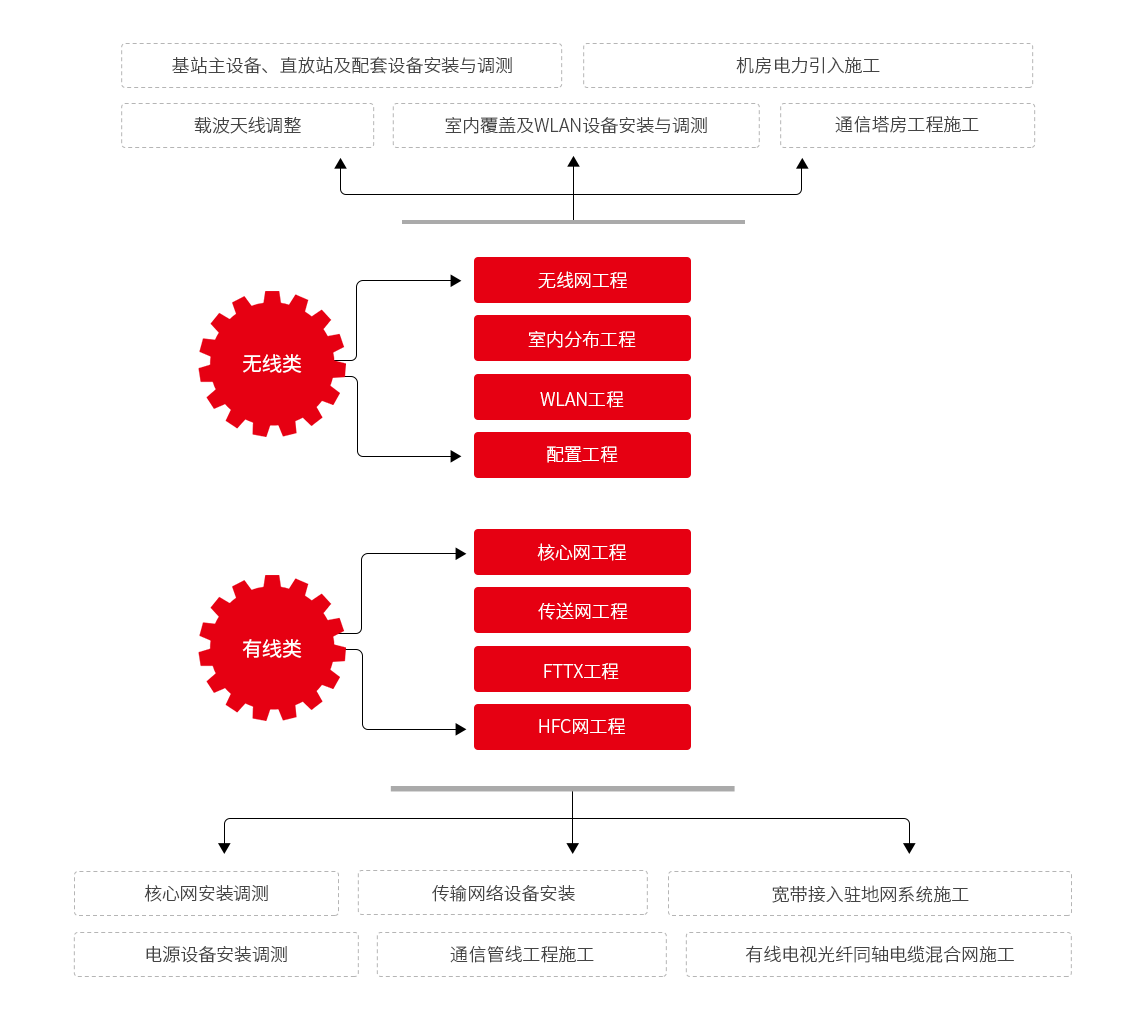 能夠提供通信建設(shè)的全專業(yè)服務(wù),業(yè)務(wù)范圍包括核心網(wǎng)工程、傳送網(wǎng)工程、FTTX工程、HFC網(wǎng)工程、無線網(wǎng)工程、室內(nèi)分布及WLAN工程等專業(yè)。施工內(nèi)容包含核心網(wǎng)設(shè)備安裝調(diào)測(cè)、電源設(shè)備安裝調(diào)測(cè)、傳輸網(wǎng)絡(luò)設(shè)備安裝調(diào)測(cè)、基站主設(shè)備安裝調(diào)試、直放站及配套設(shè)備安裝調(diào)測(cè)、室內(nèi)覆蓋及WLAN設(shè)備的安裝調(diào)測(cè)、寬帶接入駐地網(wǎng)、系統(tǒng)集成施工、有線電視光纖同軸電纜混合同施工、通信管線工程施工、載波及天線調(diào)整等;為客戶提供多元化施工解決方案,以及優(yōu)質(zhì)的全方位服務(wù)。